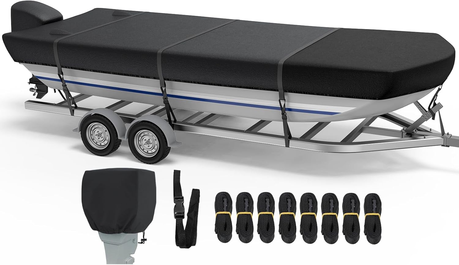 - Excellent Windproof & Snugly Fit - 9 pcs adjustable tie-down straps with quick-released buckles provides easy installation and quick release, keeping the boat cover firmly in place to prevent the cover from blowing away. Bottom all-around elastic cord and hem ensures a 360 degree custom-fit for your boat. Enjoy peace of mind knowing your boat is protected with a perfect, secure fit every time