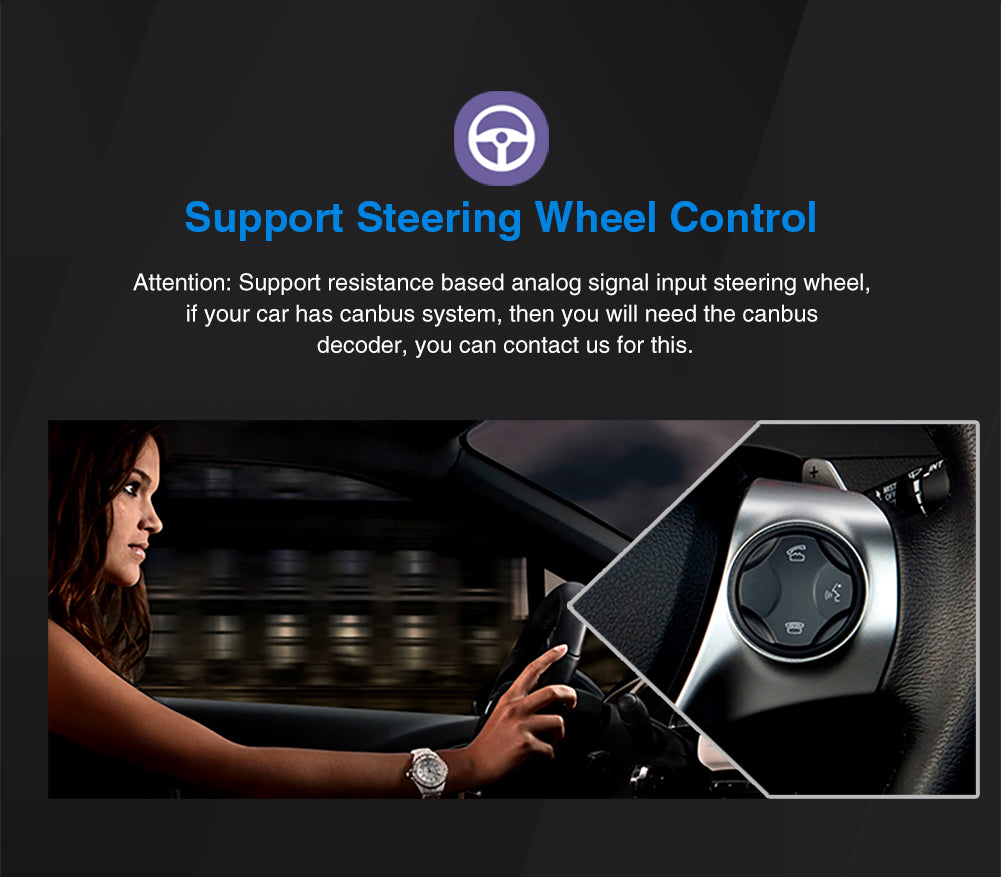 Setup and connect the steering wheel control interface on the Pumpkin head unit with your vehicle to change the track, volume, etc. conveniently without taking your hands off the steering wheel, to control and change your driving entertainment system without compromising a tiny single safety. (Attention: Only support resistance based analog signal input steering wheel)
