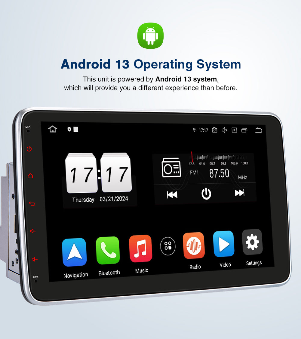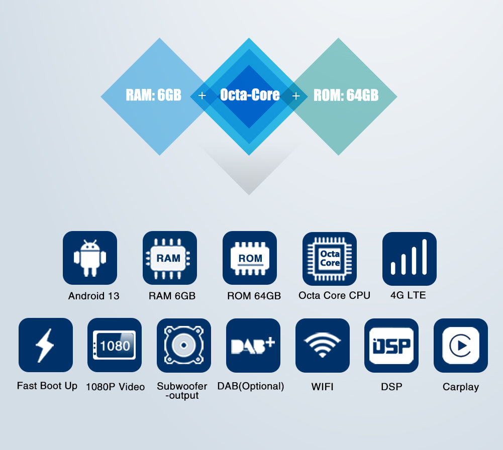 - Android 13, RAM:6GB, 64GB ROM, CPU: Qualcomm QCM6125 Quad-core ARM Cortex-A73 2.0GHz + Quad-core ARM Cortex-A53 1.8GHz, High quality radio IC: NXP TEF6686, with good radio reception.