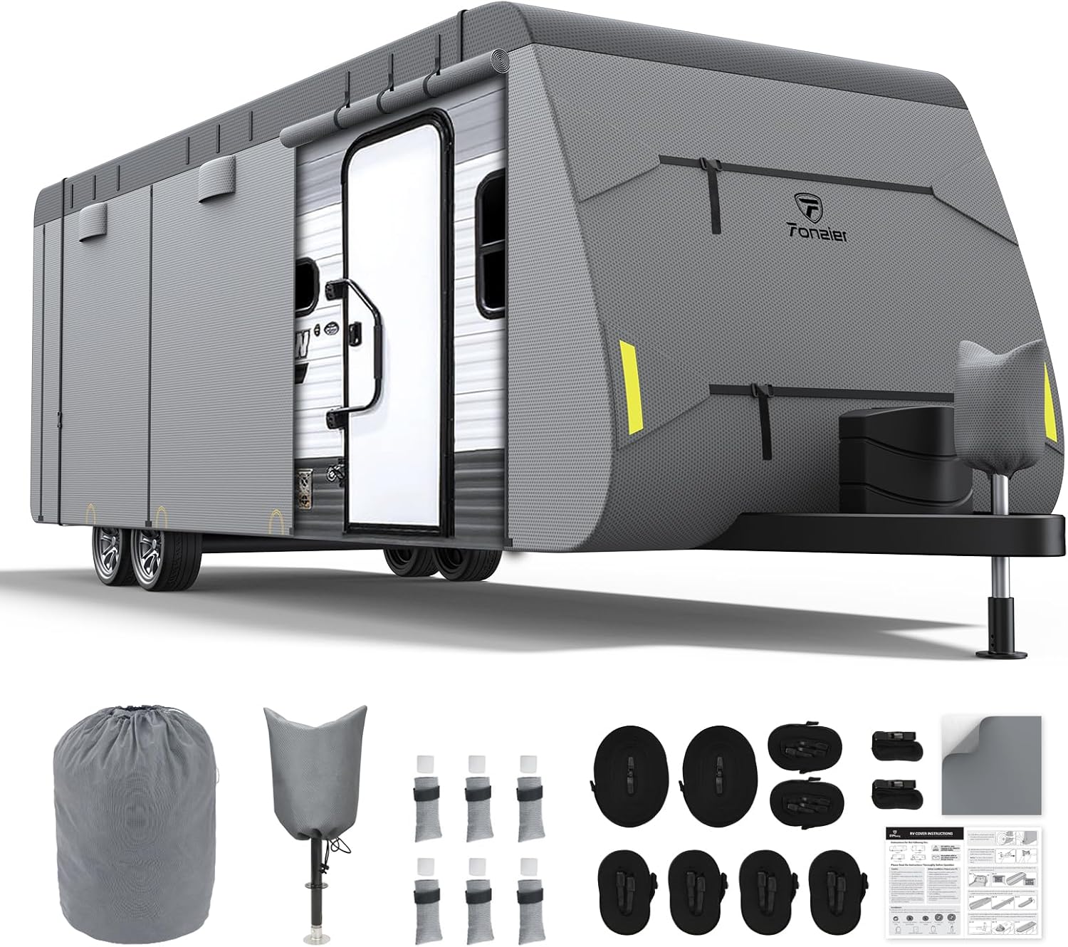 - 【Complete Package & Simple Setup】Comes with everything you need: 1 RV cover, 2 wrap-around straps, 4 bottom straps, 2 front straps, 2 rear straps, 2 toss sticks, 1 electric tongue jack cover, 6 gutter spout covers, 1 repair patch, and a convenient storage bag. Detailed instructions included for hassle-free installation.
