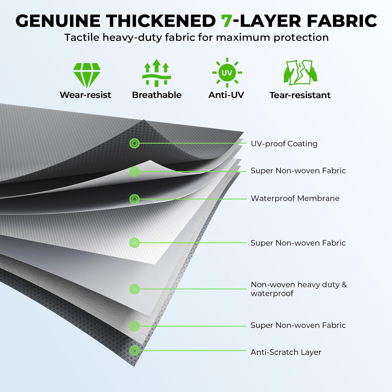 - 【7-Layer All-Weather Protection】Upgraded with a heavy-duty 7-ply top and 3-ply reinforced sides, this RV cover combines an anti-UV composite and waterproof membrane to resist fading, tearing, and premature aging. It shields your RV from sun, rain, snow, wind, dust, and scratches for year-round protection.