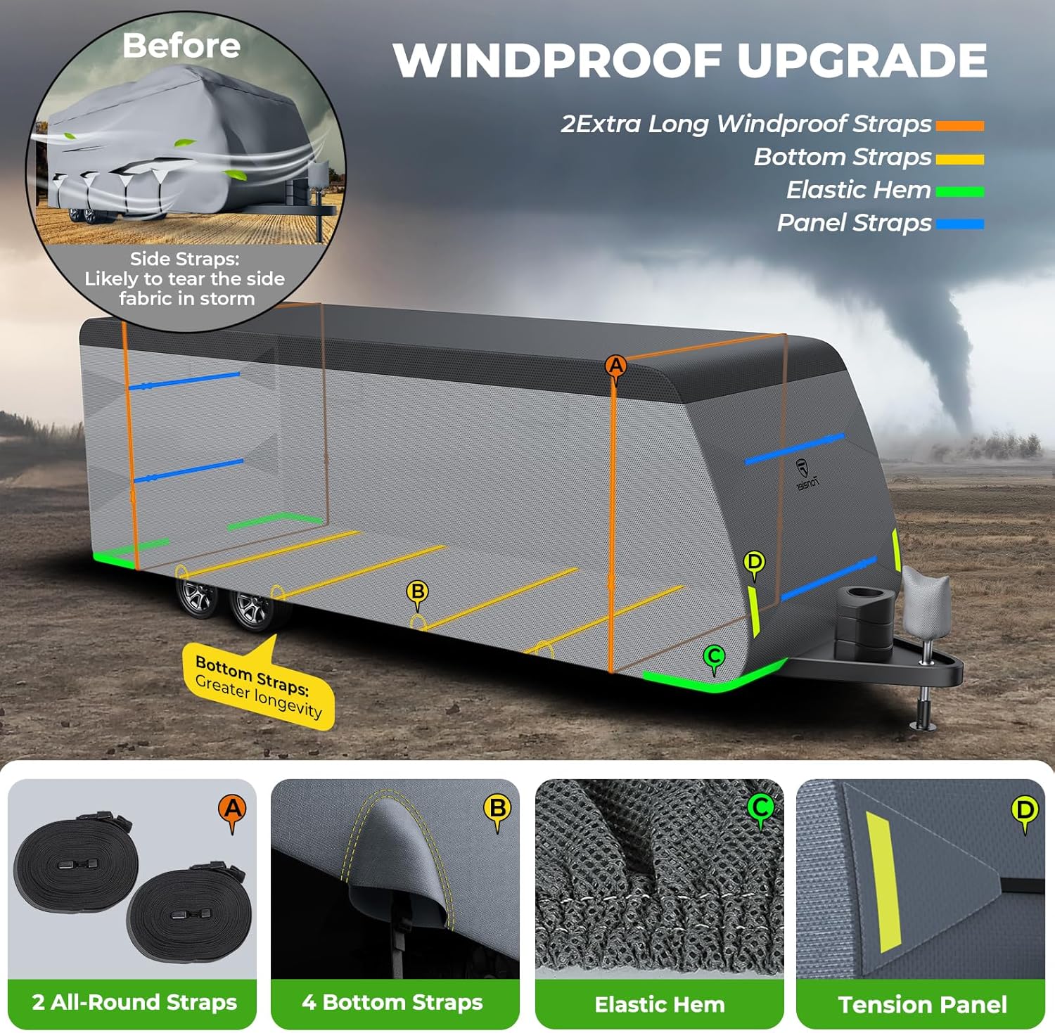 - 【Windproof & Secure Fit】Equipped with 4 reinforced bottom straps and buckles plus 2 extra-long 42" straps that wrap around the RV, this cover stays firmly in place—even on windy days—providing a tight, custom-like fit.