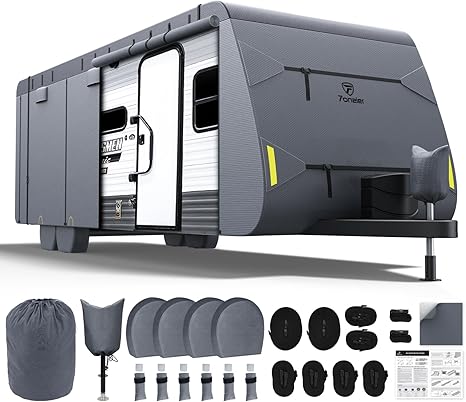 - 【Abundant Accessories】: Included in the package are: ①: Travel trailer cover x 1, ②: Additional windproof straps x 2, ③: Tire cover x 4, ④: Tongue jack cover x 1, ⑤: Gutter spout cover x 6, ⑥: Toss metal sticks x 2, ⑦: Adhesive repair patch x 1, ⑧: Large storage bag x 1
