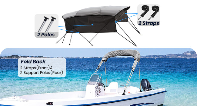 - With Rear Support Poles: The boat bimini top is equipped with 2 rear support poles which ensure stability. The rear support poles are solider than traditional straps. They can be easily removed and stored. It’s space-saving and really convenient for next time use.