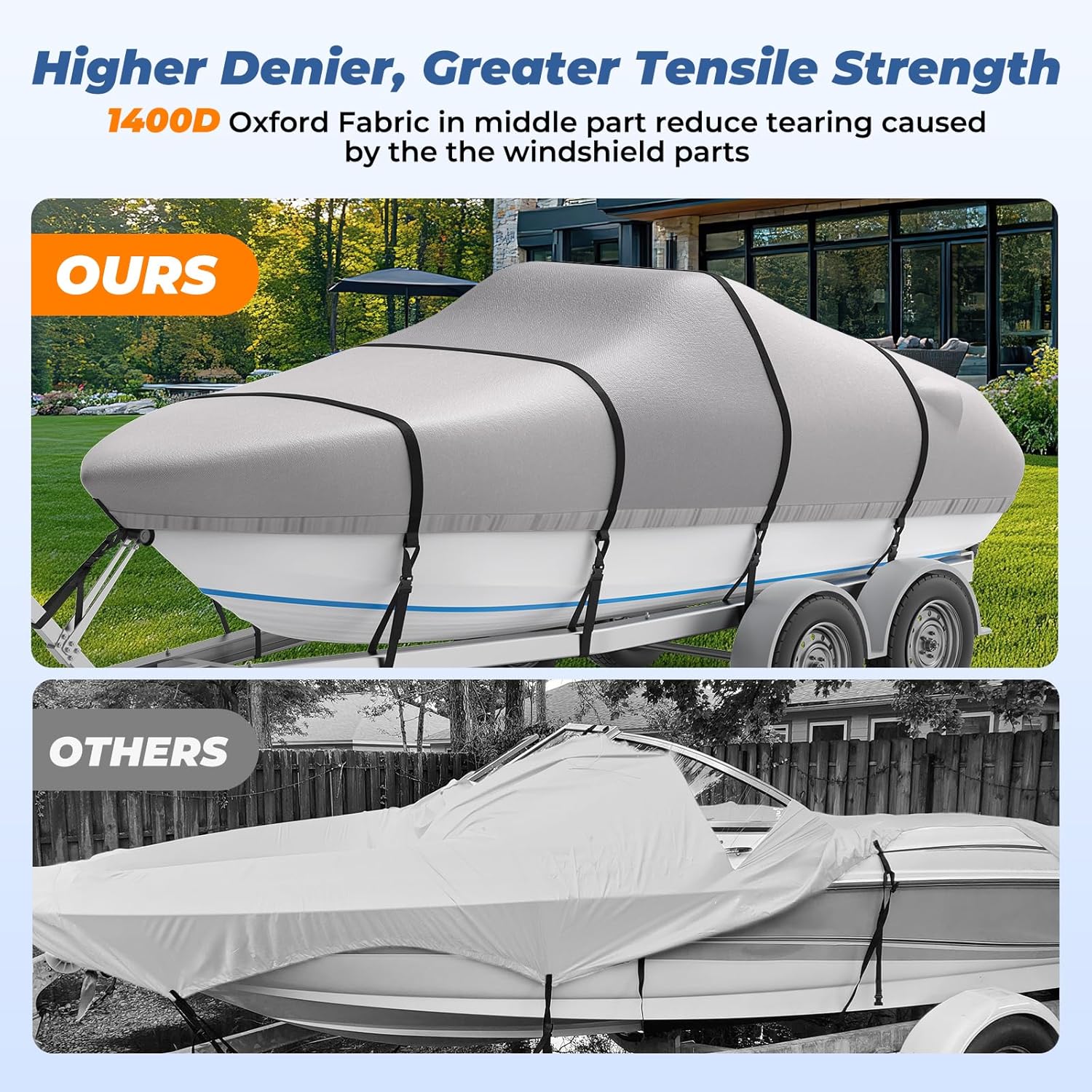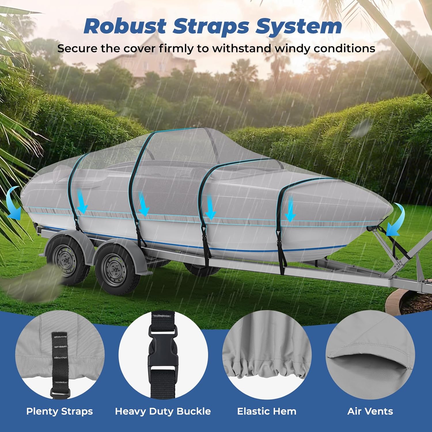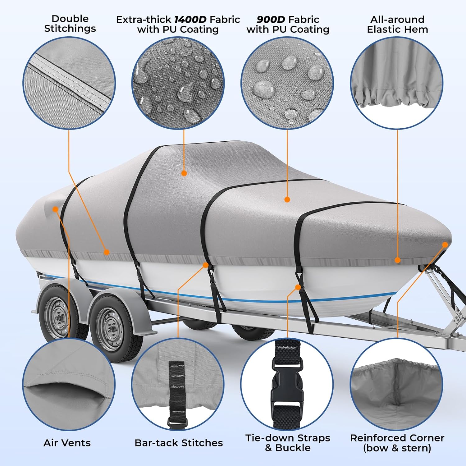 RVMasking Boat Cover, 1400D Heavy Duty Middle Reinforced, Waterproof Trailerable with Storage Bag for V-Hull, Tri-Hull, Fish & Ski, Runabout Bass Boat